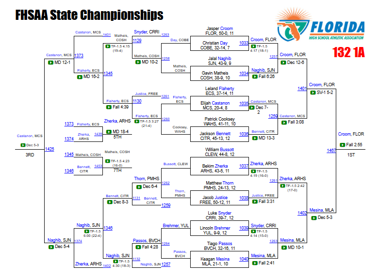 Best non-finals match: Croom dec. Castanon SV-1 5-2. One of the most anticipated semifinals did not disappoint. Croom got a late escape after a Castanon reversal in the third to force the match to sudden victory. The two battled hard in the extra frame with the eventual state champion Croom pulling off the win with nine seconds left.