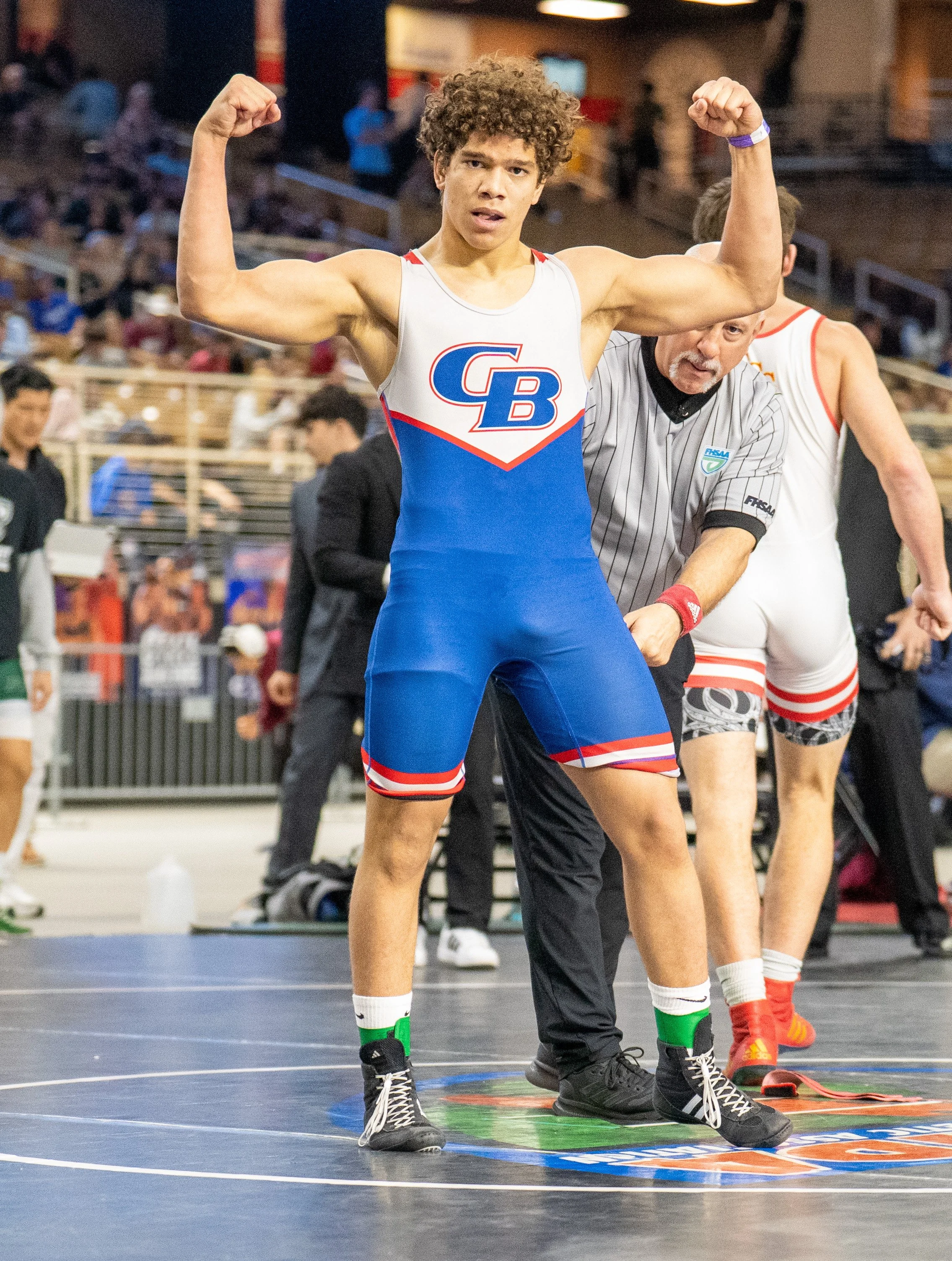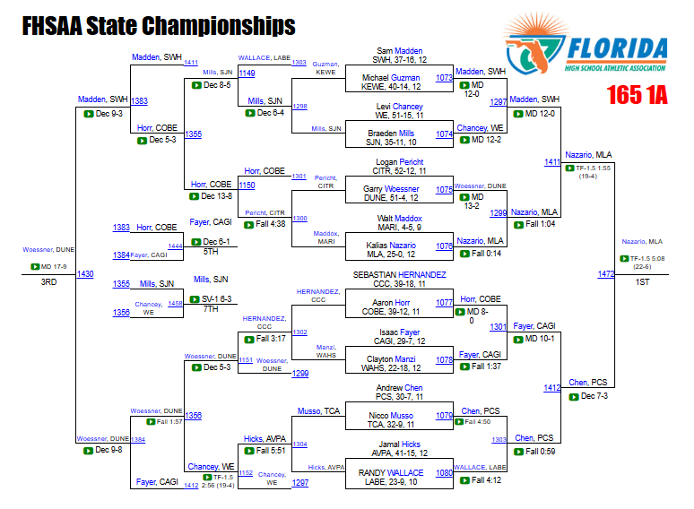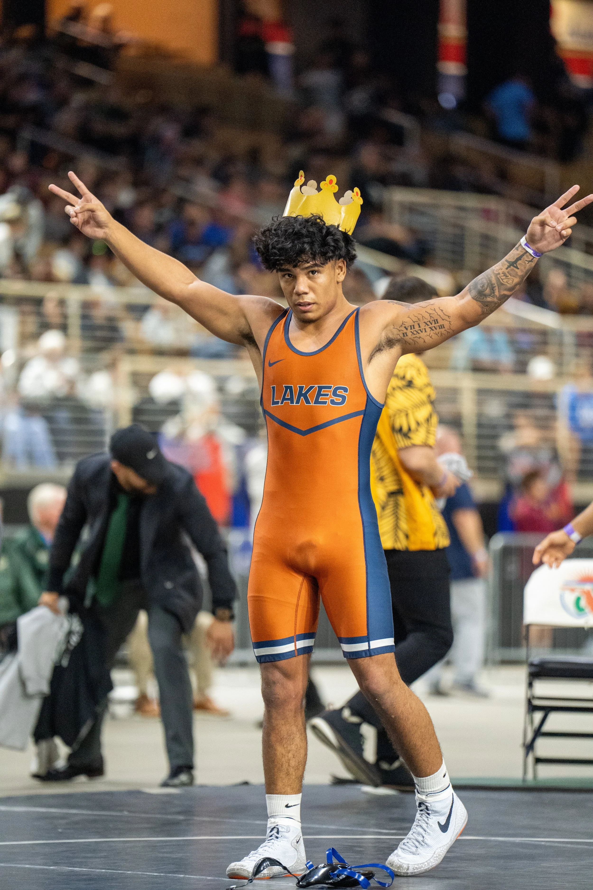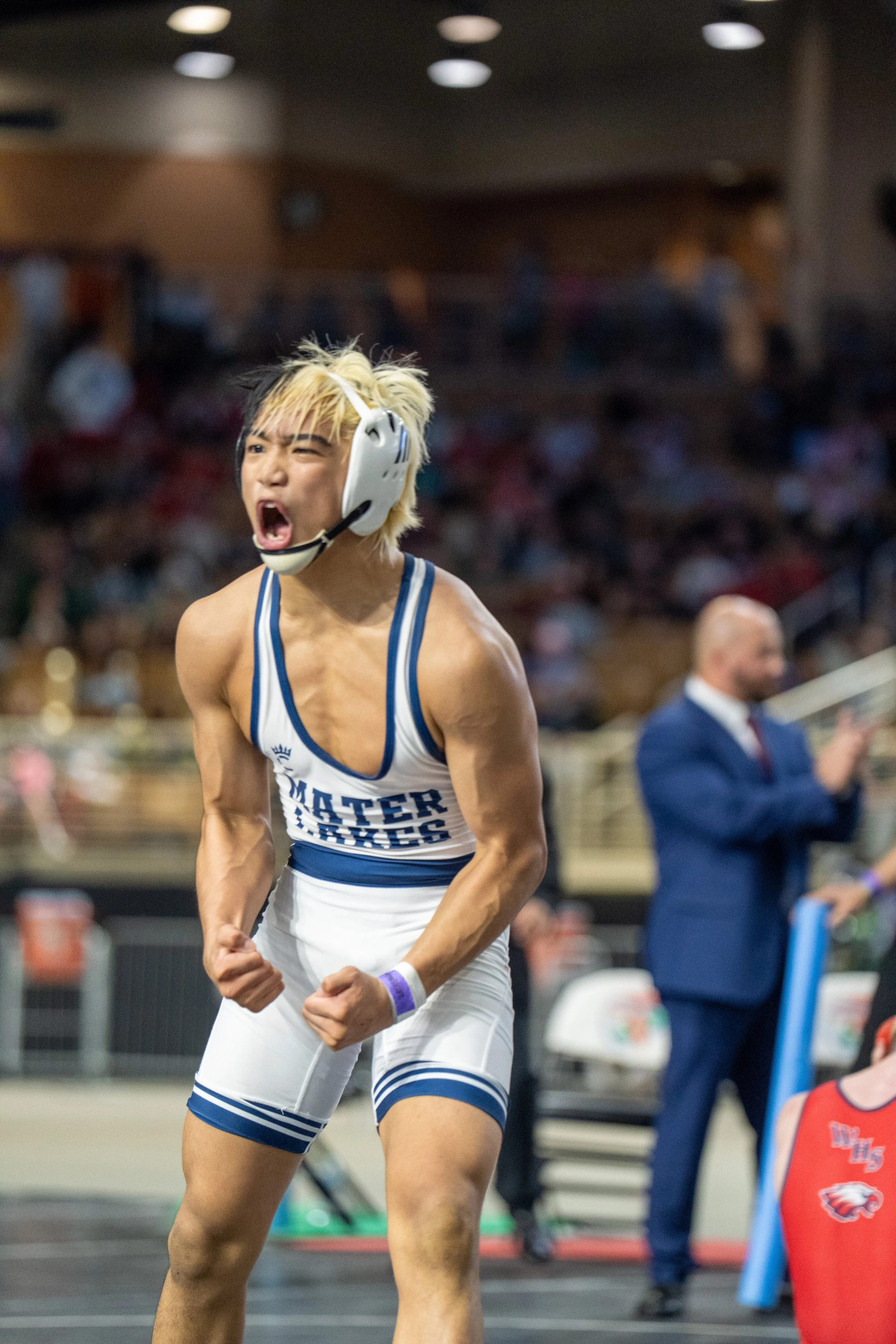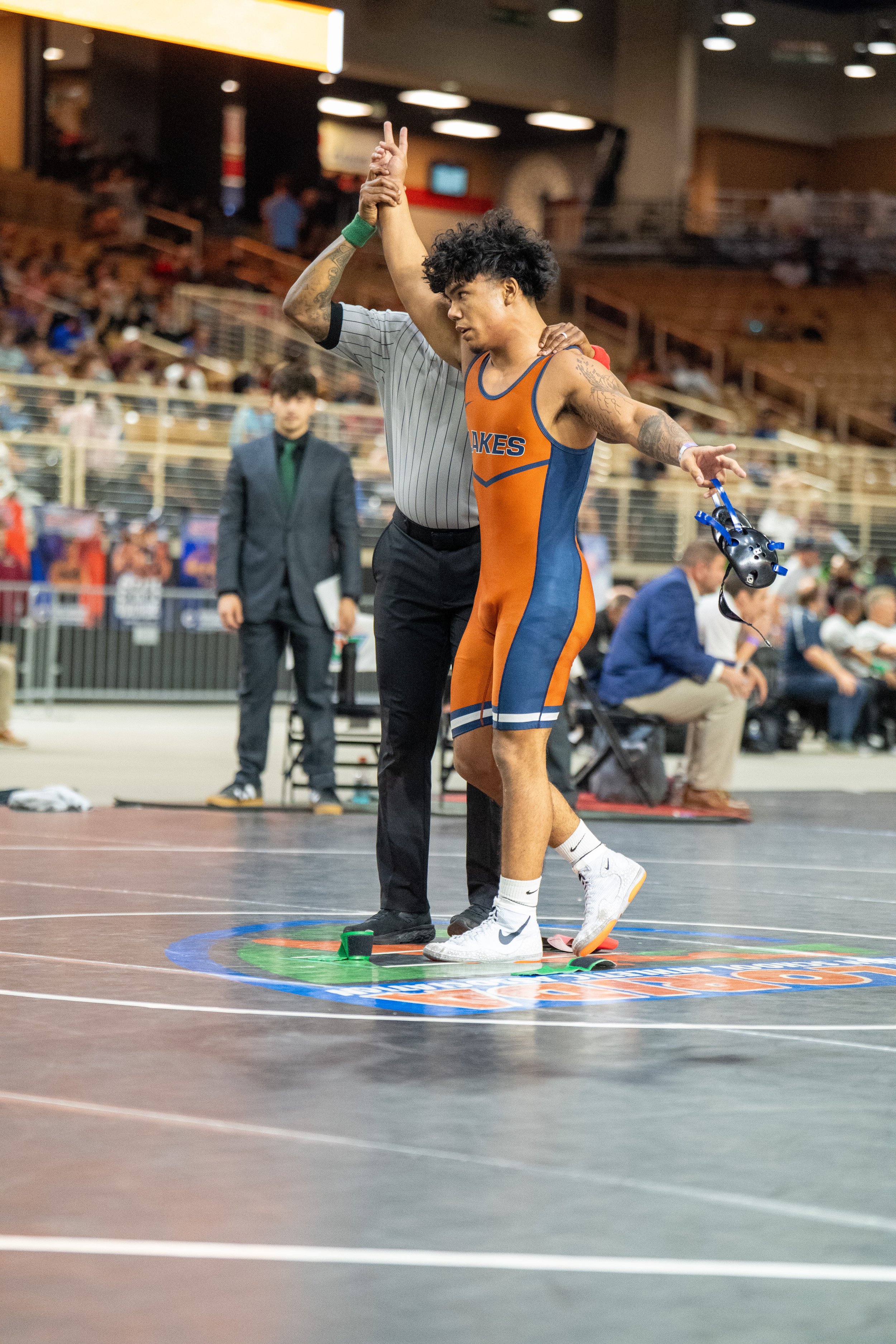 Champion: Kalias Nazario tech. Andrew Chen 22-6. The Mater Lakes senior won his second state title in impressive fashion, dominating the final with seven takedowns.