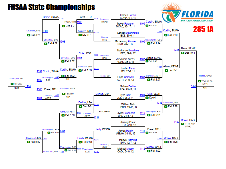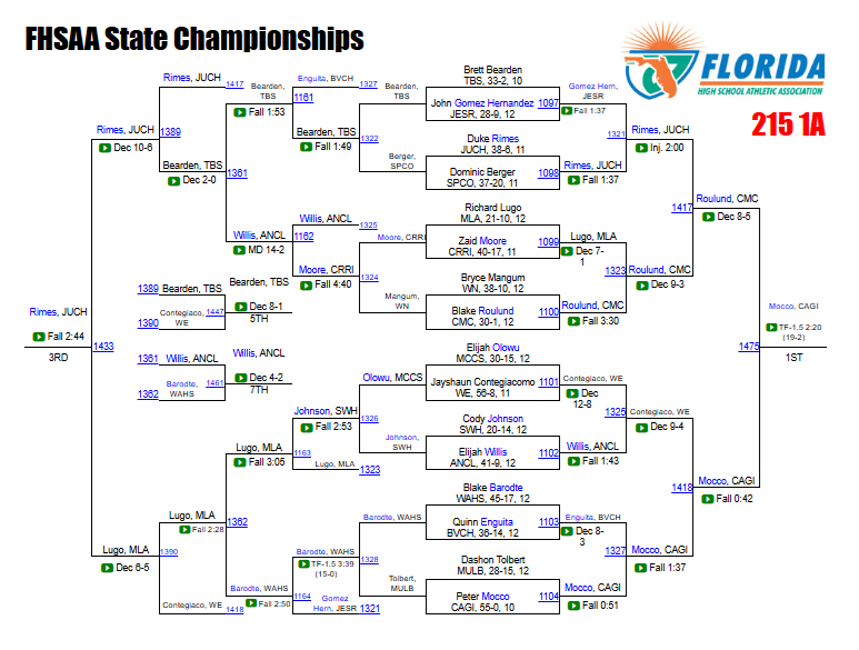Champion: Michael Mocco tech. Alexandre Allens 20-4. It was the end of an era for one of Florida’s best all-time high school wrestlers. Mocco won his fourth state title and ended his high school career with a bow and a flip.