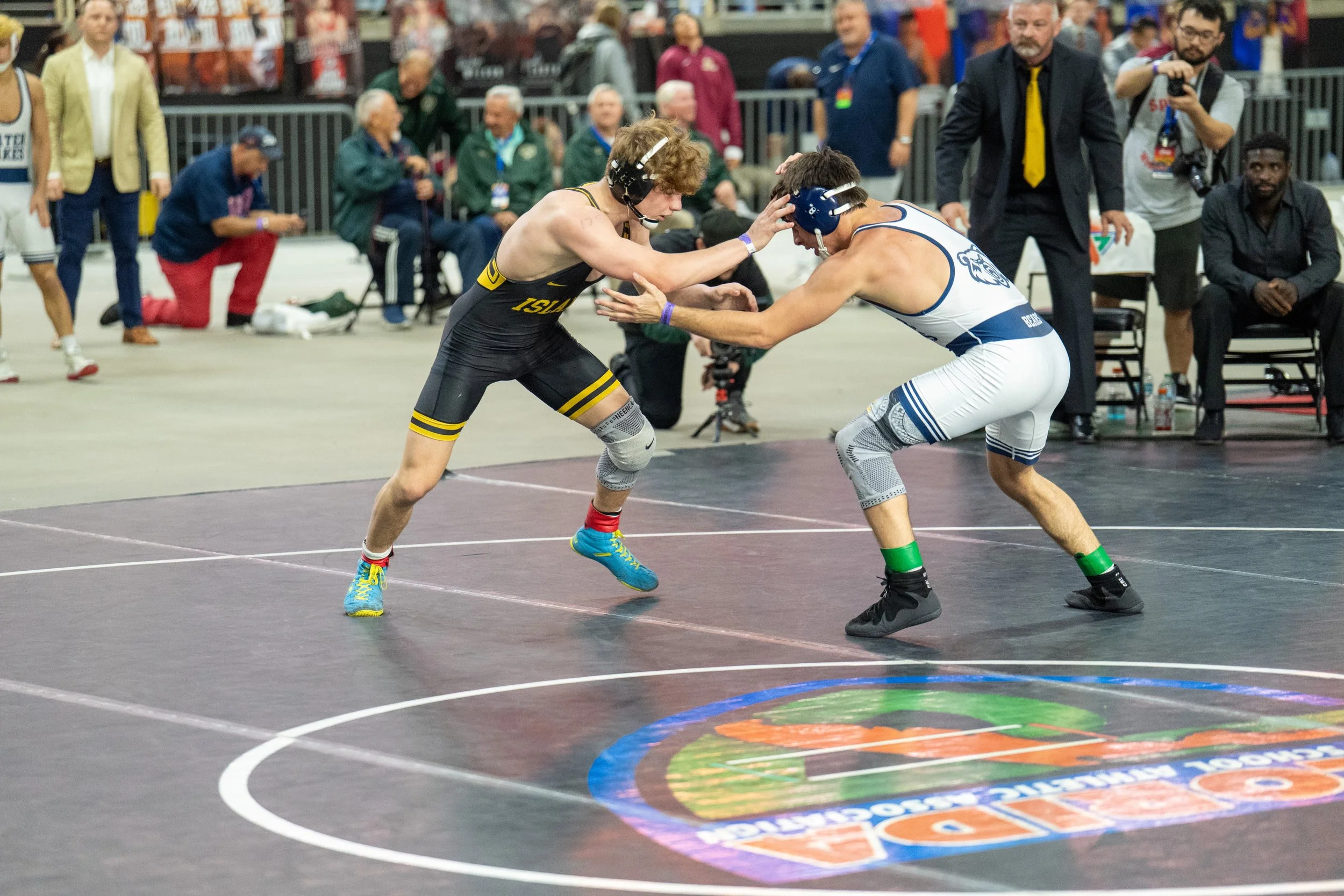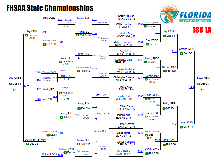 Champion: Timmy Boda dec. Christopher Greene 8-7. Boda leapt out to a 6-1 lead in the first period after two takedowns and then earned his second state title.