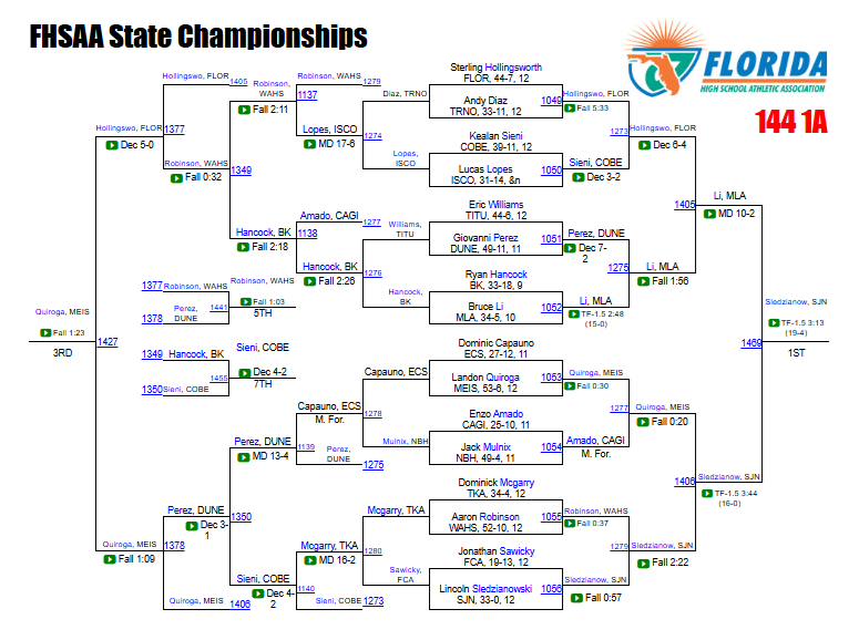 Champion: Lincoln Sledzianowski tech. Bruce Li 19-4. The St. John Neumann senior scored six takedowns to win his second Florida state title.