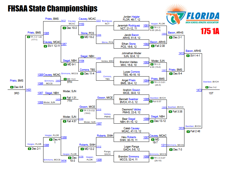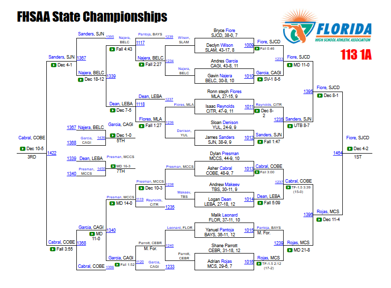 Champion: Bryce Fiore dec. Adrian Rojas 4-2. One of the best middle school wrestlers in the country earned his state title with a close win over another Florida seventh grader.
