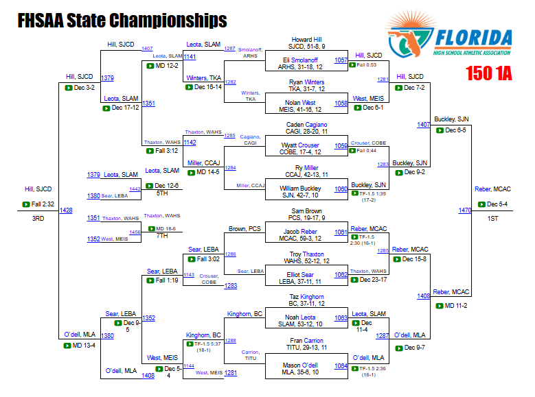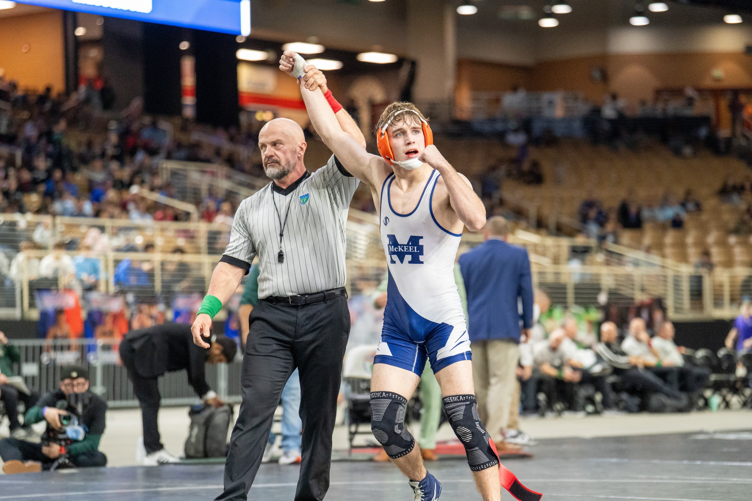 Champion: Jacob Reber dec. William Buckley 5-4. Reber’s second period takedown gave him the lead and then the McKeel senior held off a flurry of attacks by Buckley down the stretch to win the title.