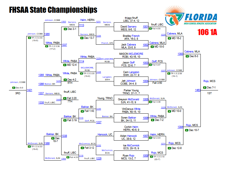 Champion: Ryan Rojo dec. Jack Cabrera 7-1. The Miami Christian seventh grader used takedowns in the first and second period to win his first-ever state title.