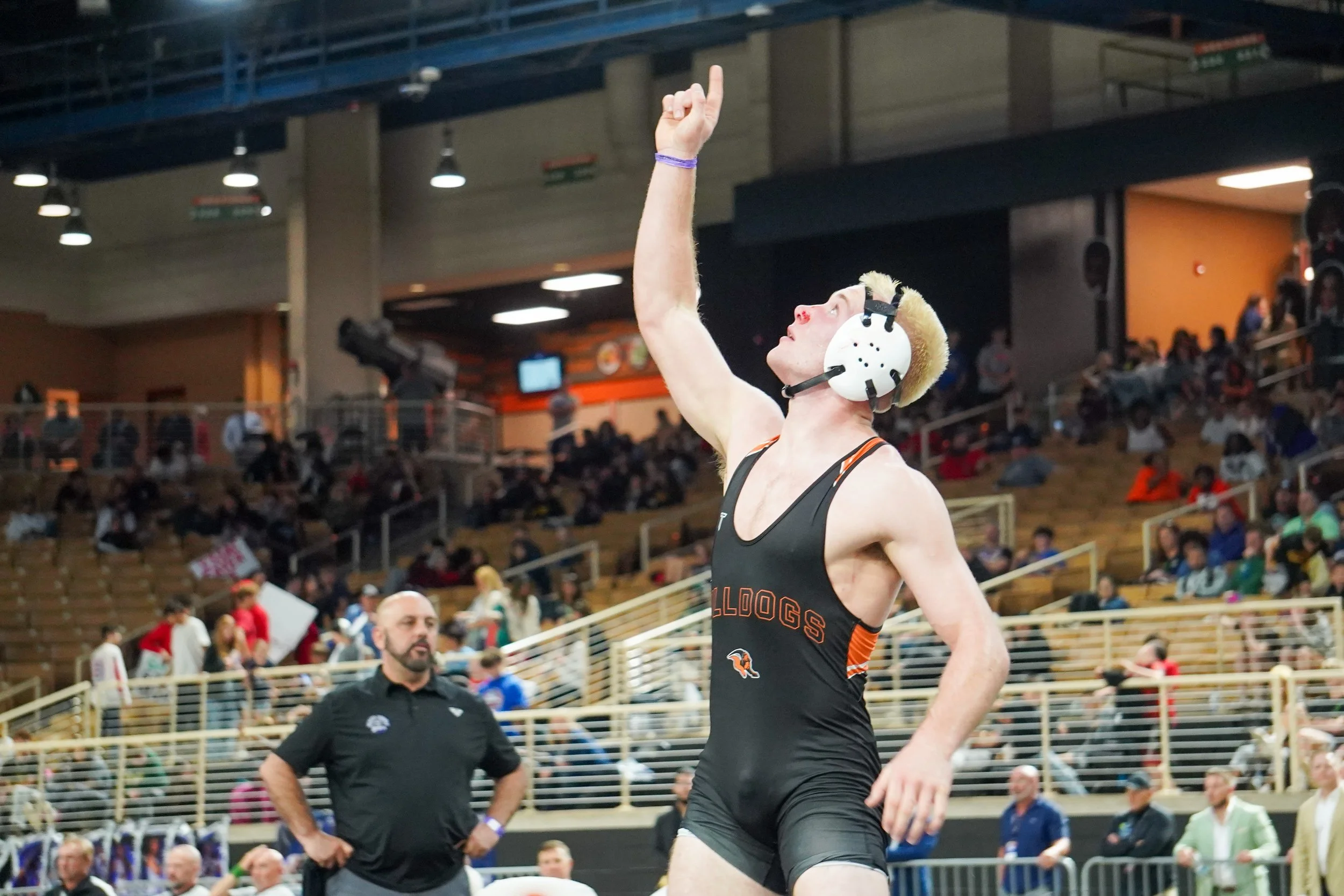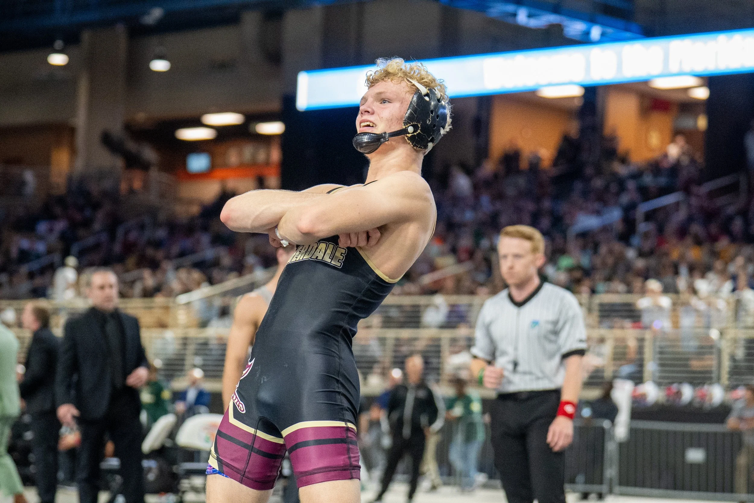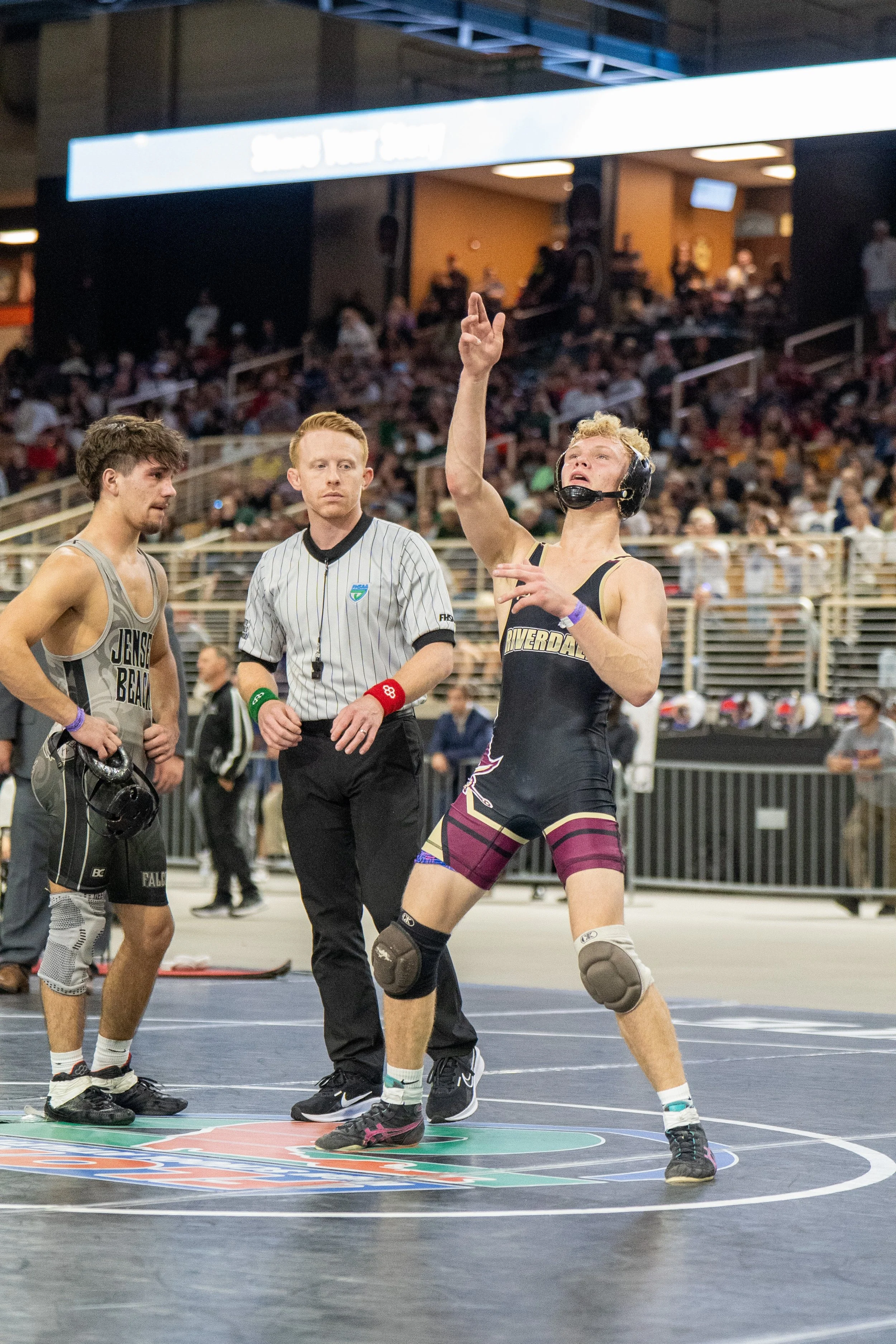 Champion: Reid Yakes dec. Joseph Scott 4-1. Yakes broke a 1-1 tie with 42 seconds left by scoring a takedown and winning the state title.