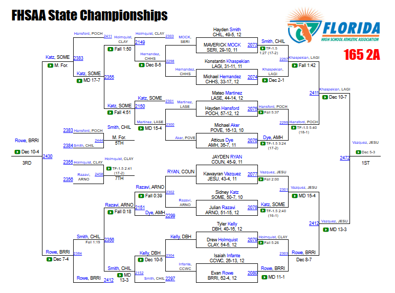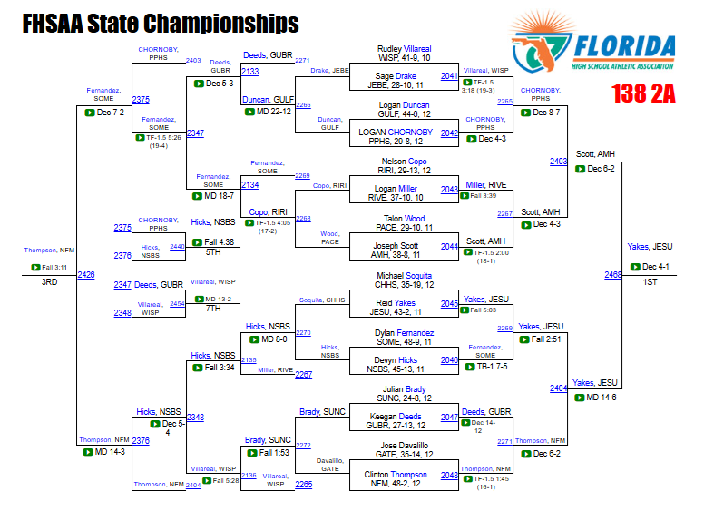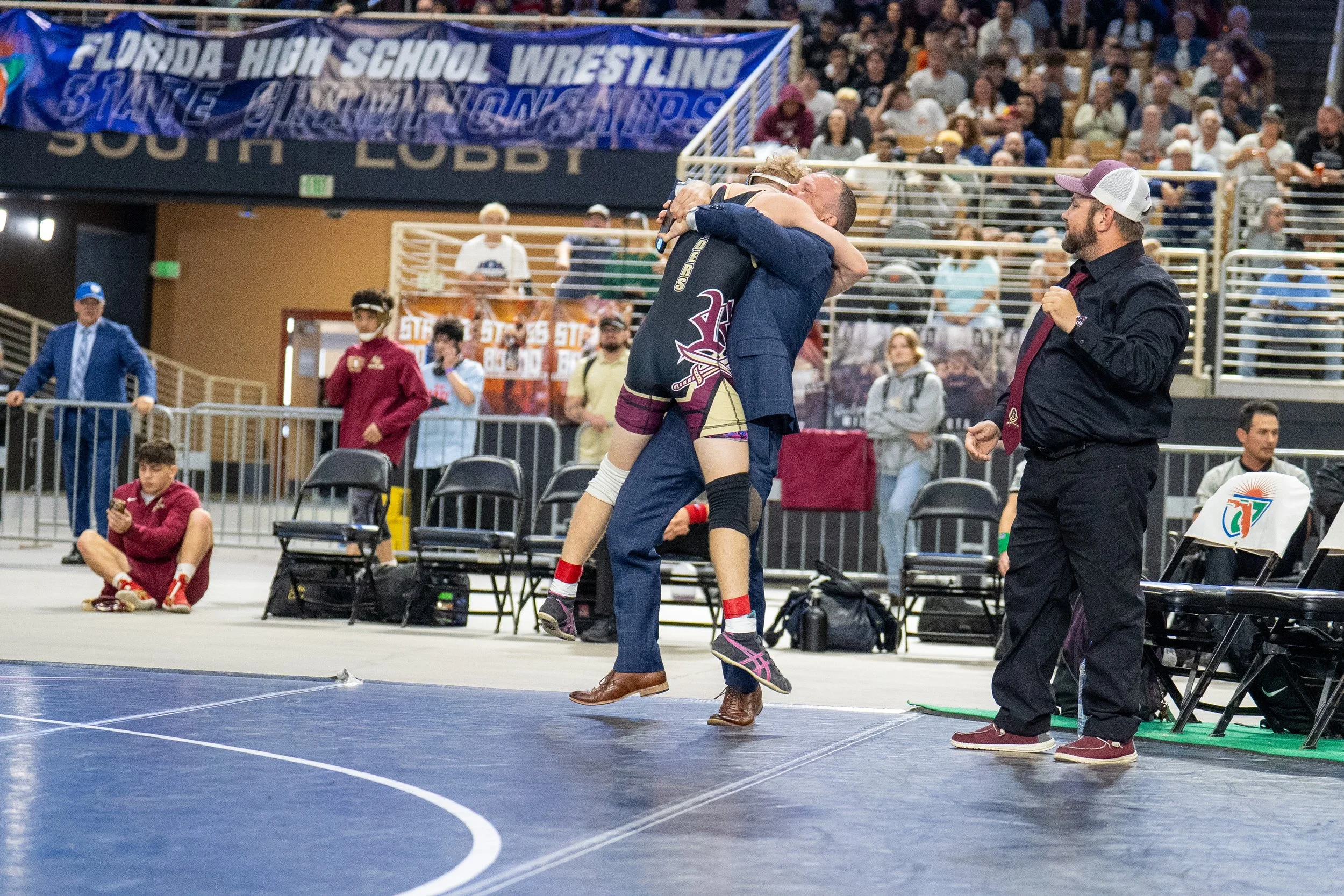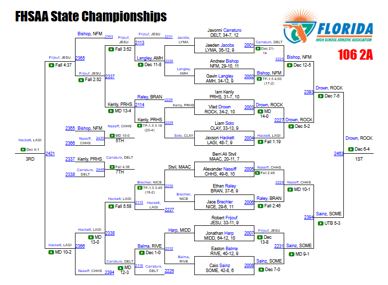 Champion: Vlad Drown dec. Caio Sainz 6-4. Drown’s two takedowns in the second period helped the Rockledge sophomore rally to win his first state title.