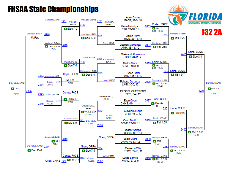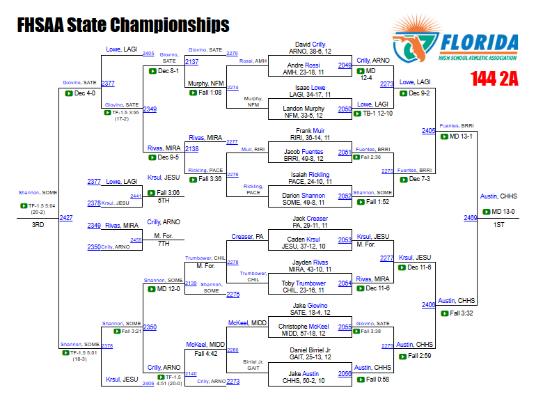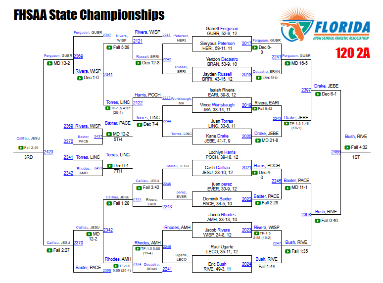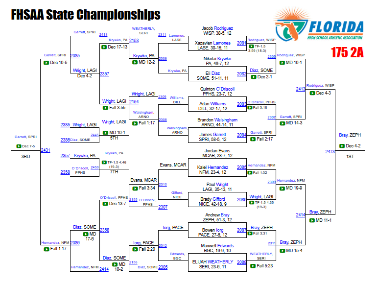 Champion: Andrew Bray dec. Jacob Rodriguez 4-2. One of the most exciting finishes on Saturday night saw the Zephyrhills wrestler win his school’s first state title since 2003 on a takedown with nine seconds left.