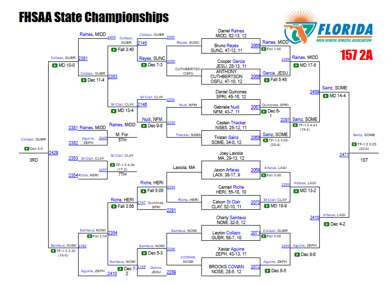 Best non-finals match: Sainz dec. Nassiff UTB 5-3. In one of the most exciting semifinals in the tournament. Sainz scored on a reversal in double overtime to reach the state finals as a sixth-grader.