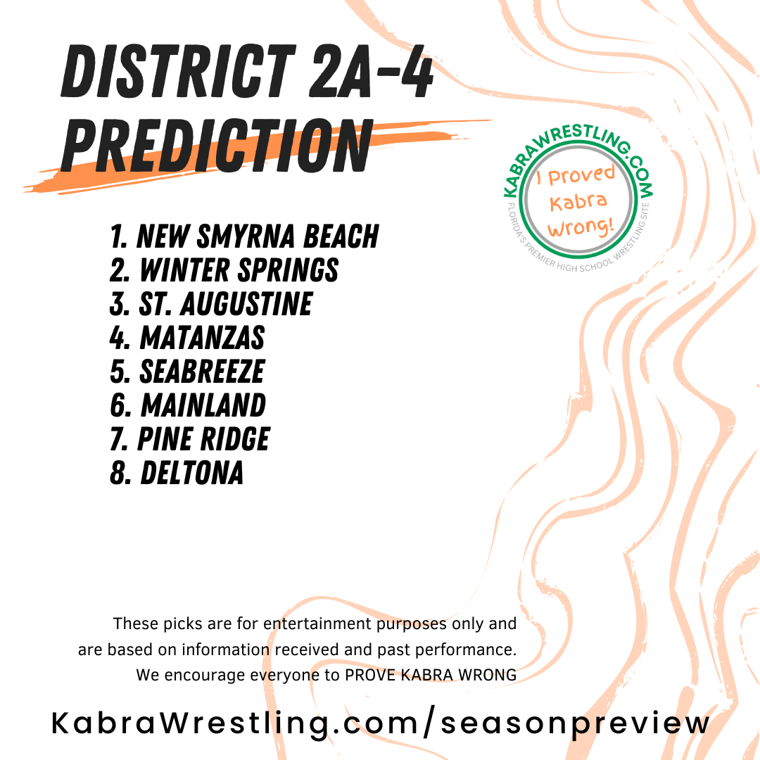 Wrestlers to watch: Jacob Rodriguez (Winter Springs), Wyatt Mayfield (New Smyrna Beach), Rudley Villareal (Winter Springs), Devyn Hicks (New Smyrna Beach), Merrick Miller (New Smyrna Beach), Jovanni Carraturo (Deltona), Cayden Torres (Winter Springs), Tyson Horel (Winter Springs), Casten Thacker (New Smyrna Beach), Ayden Keys (Winter Springs), Marco Gonzalez (Winter Springs).