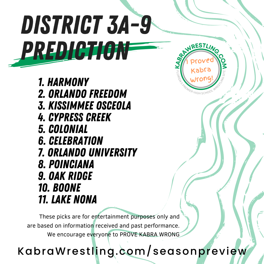 Last season: This district title race went down to the end and a big decider was Deacon Delong’s win at 190 pounds for eventual champion Kissimmee Osceola, who edged Harmony by 4.5 points.