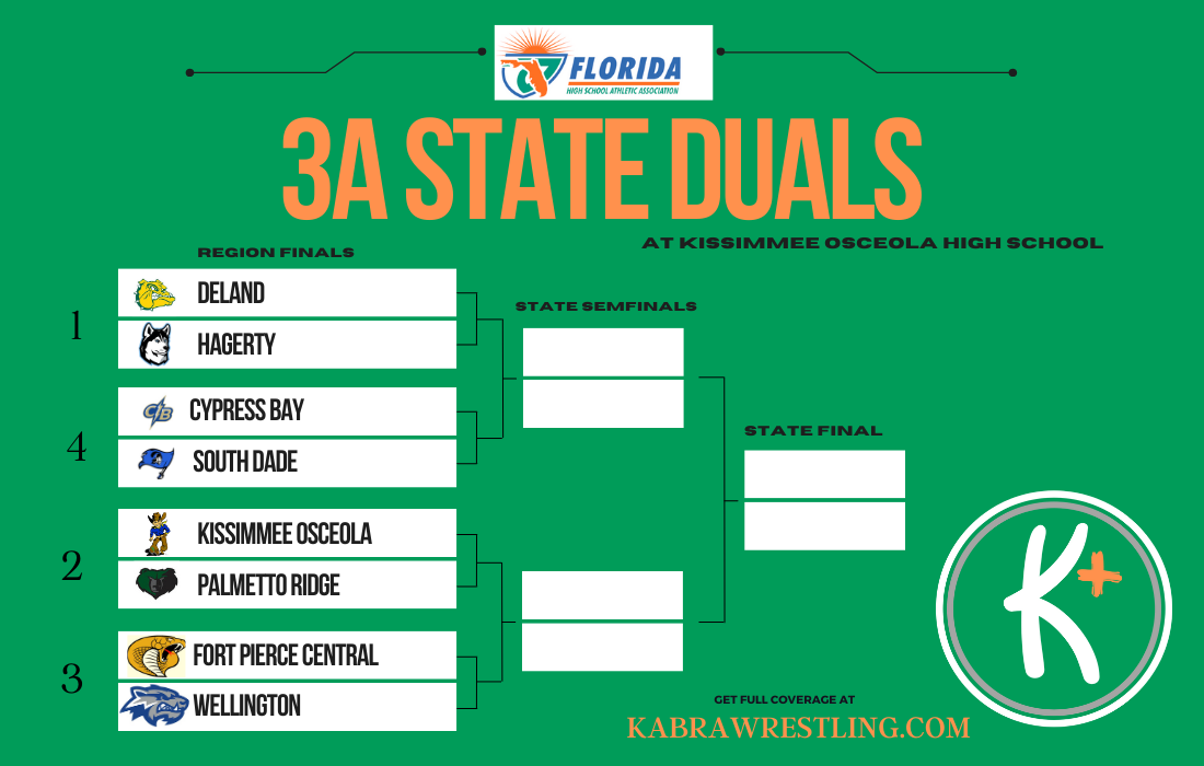 This is the fourth time in five years that Hagerty is making the trip to Kissimmee for the region final while DeLand is making its first trip to Kissimmee for the state duals tournament. The strengths of each team are located apart so this dual should come down to whose starts get the most bonus points and who wins the toss-up matches.