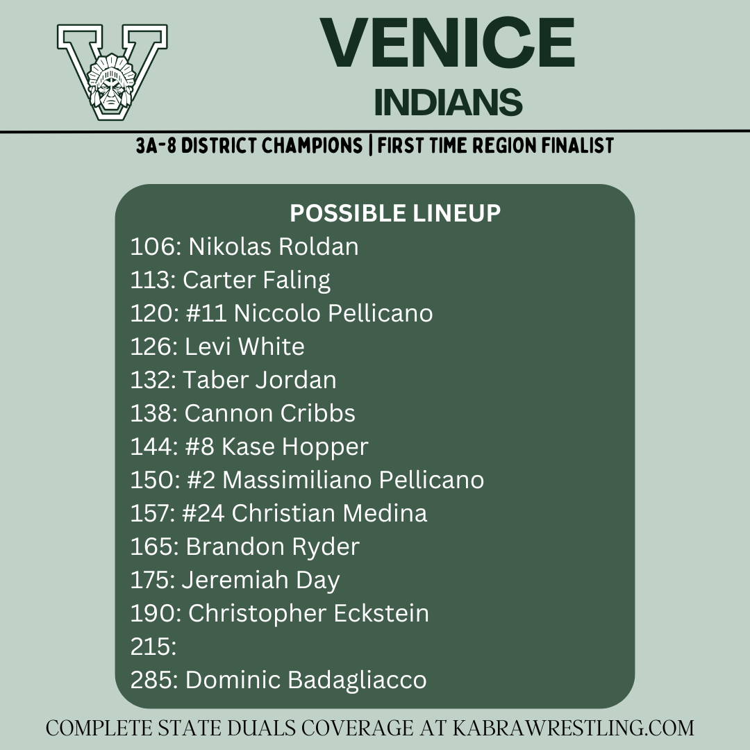 Palm Harbor University is back in the region finals for the first time since 2020 and the Hurricanes have been performing well throughout the season. They enter the weekend with five wrestlers in the Top 10 and could place a ranked wrestler in nine of the 14 bouts here. Venice is making its first trip to the state duals.