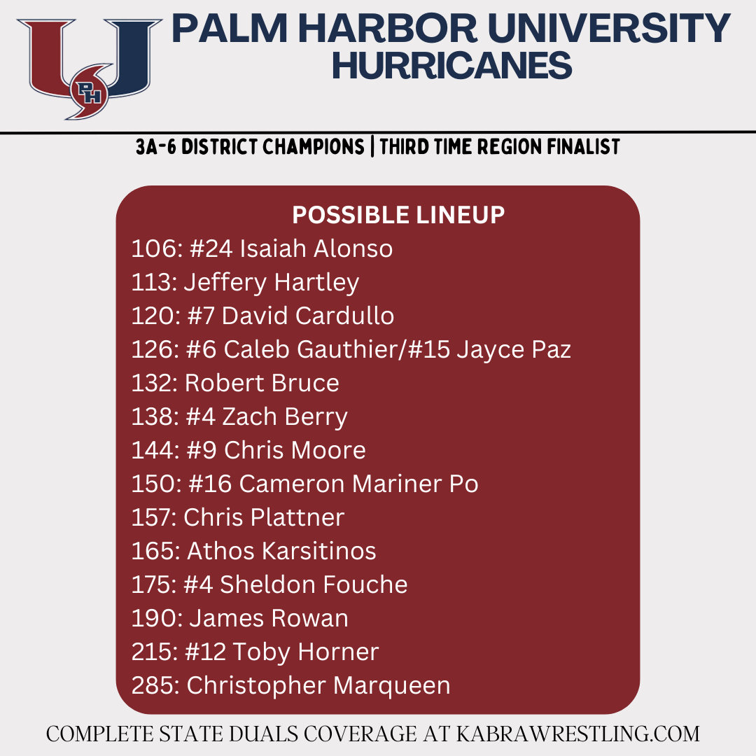 Neither team has state duals experience in the lineup, so each will be getting its first taste of the fun. Palm Harbor University is a little deeper from start to finish and that will be the difference here.