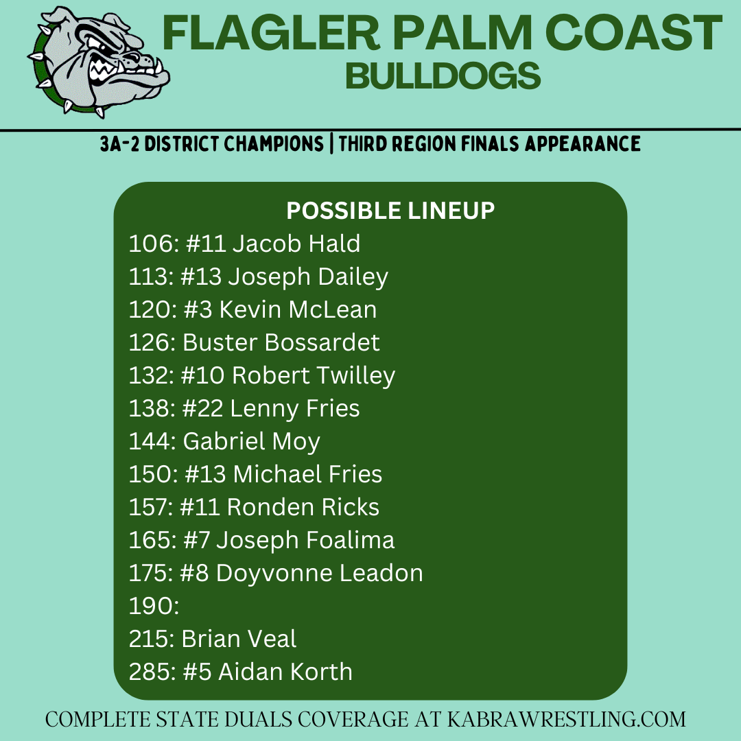 South Dade enters the weekend as the favorite in Class 3A after finally getting their full lineup healthy and proving their strength in the district duals and opening region duals round. They may not have as much room for error, but the seven-time state duals champions are still the team to beat.