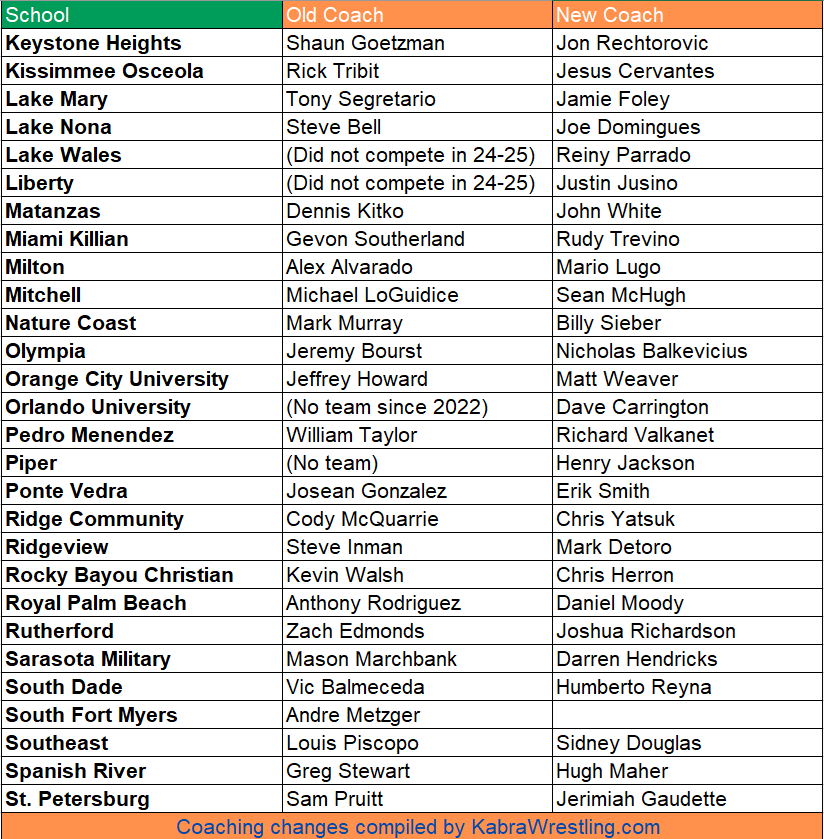 BY BRANT PARSONS — We are tracking all of the coaching changes this offseason ahead of the 2025-2026 Florida high school wrestling season.