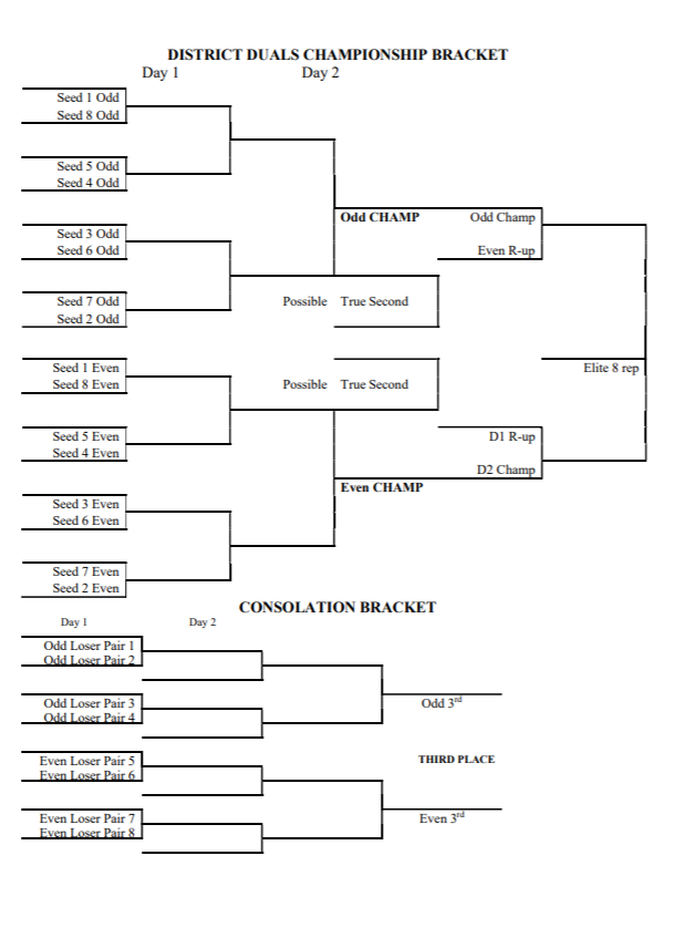 Instead of having separate district and region duals events, both will be held on the same weekend in one location for each pair of districts. Meaning that those in paired districts (1-2, 3-4, 5-6, etc.) will crown their district champion and runner-up and those four teams will then compete in the region quarterfinals and semifinals the same weekend.