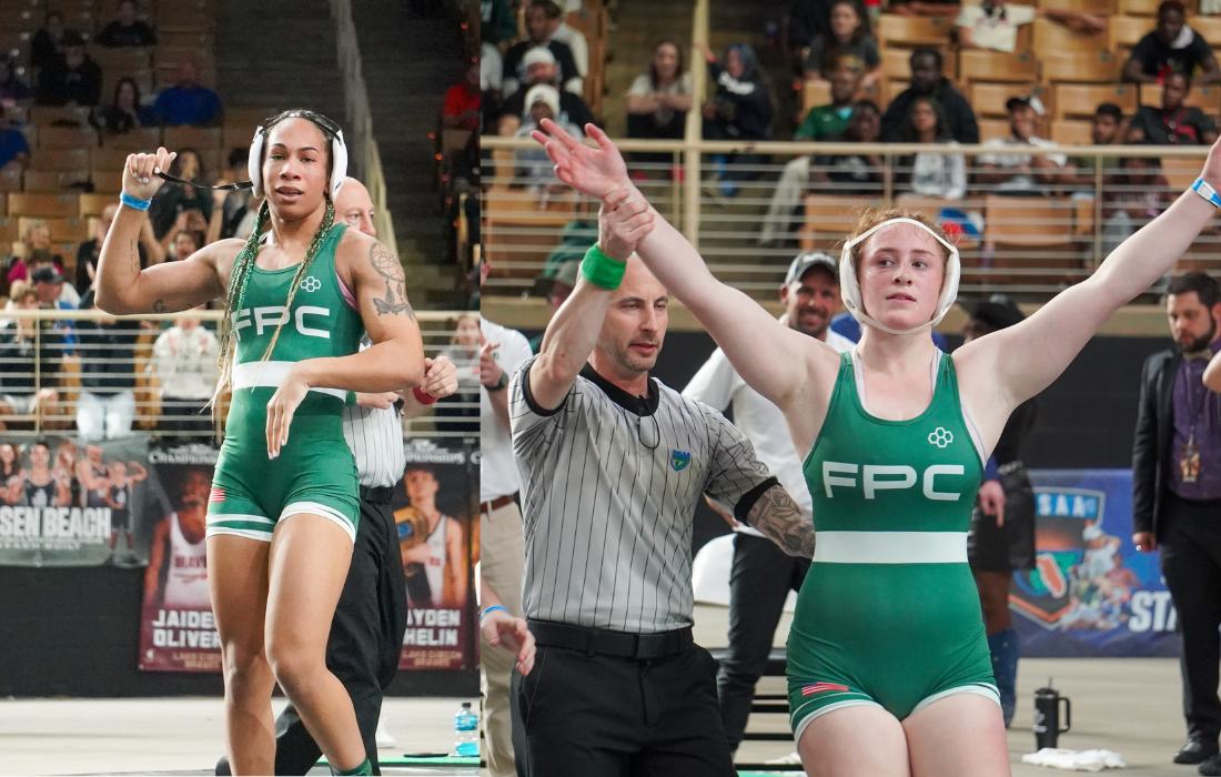Flagler Palm Coast’s Christina Borgmann (L) and Kendall Bibla (R) celebrate their state titles on Saturday night at the Silver Spurs Arena. (Photos by London Parsons/Kabra Wrestling)