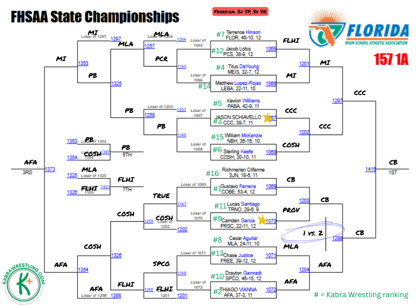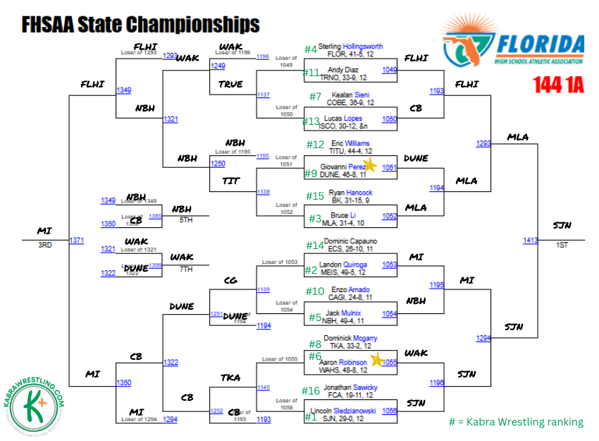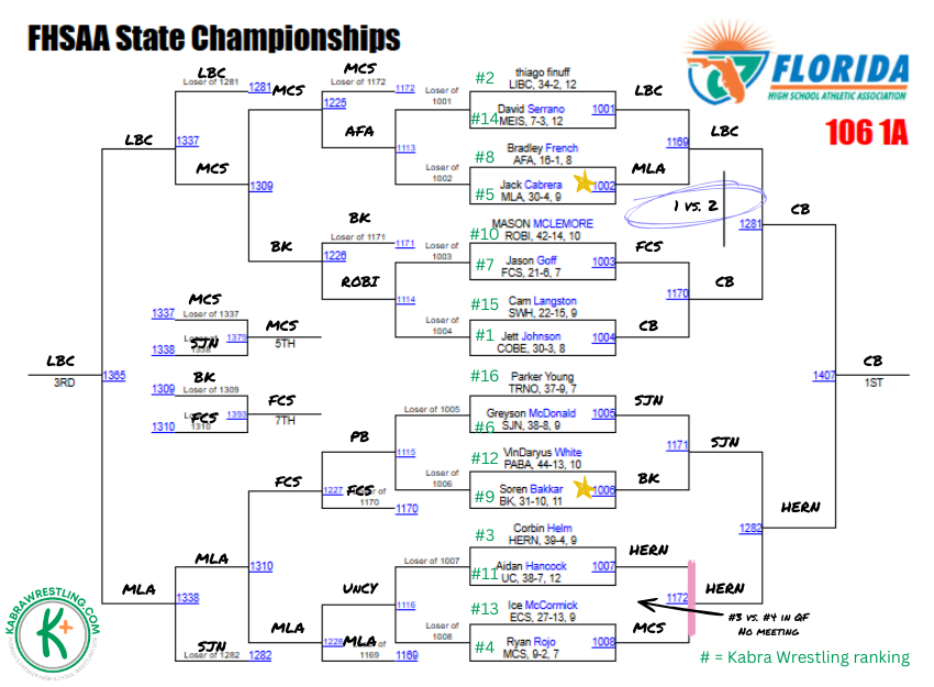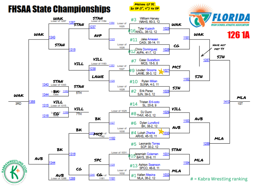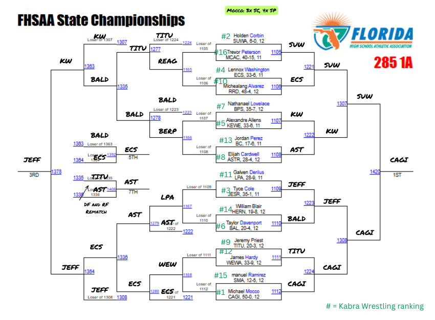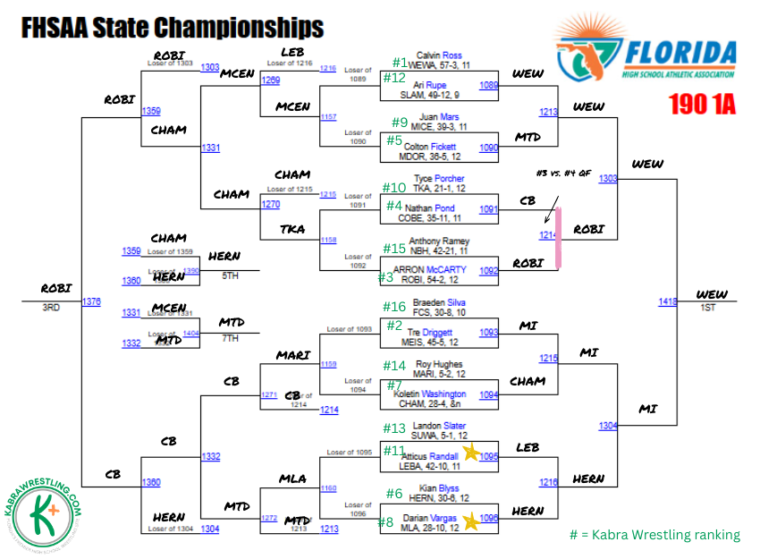 First round matches you can't miss: Landon Slater (Suwannee) vs. Atticus Randall (Lemon Bay); Blyss vs. Vargas