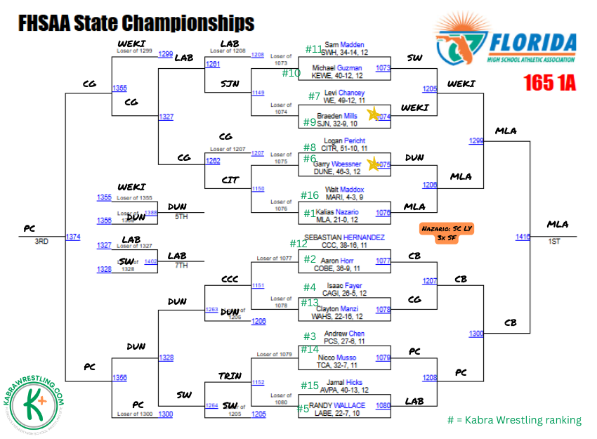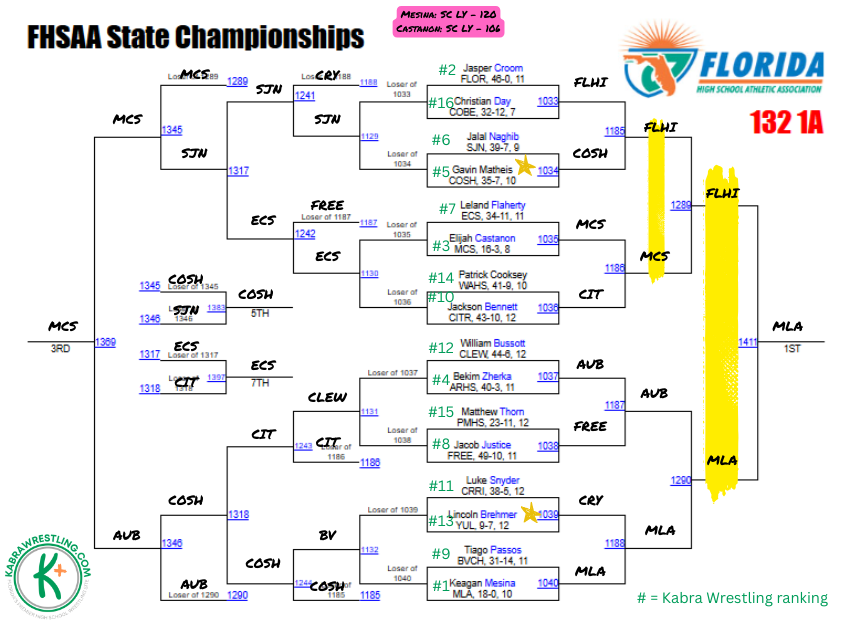 Kabra says: While the top spot seems more cut and dry with returning state champion Mesina the favorite here, there are some big matches early that will shape this bracket and we likely will have at least one Top 8 matchup to reach the podium.