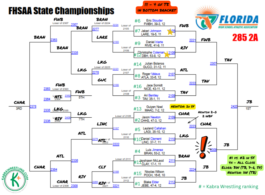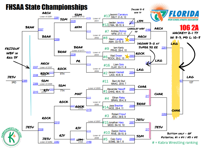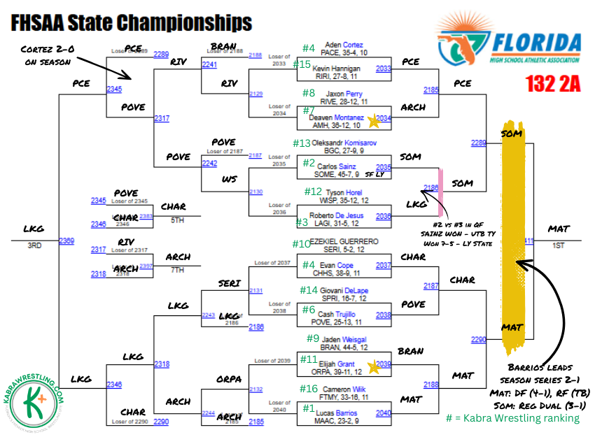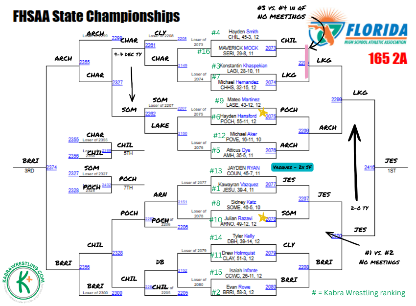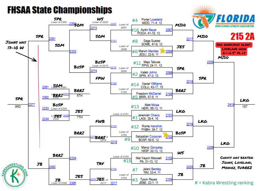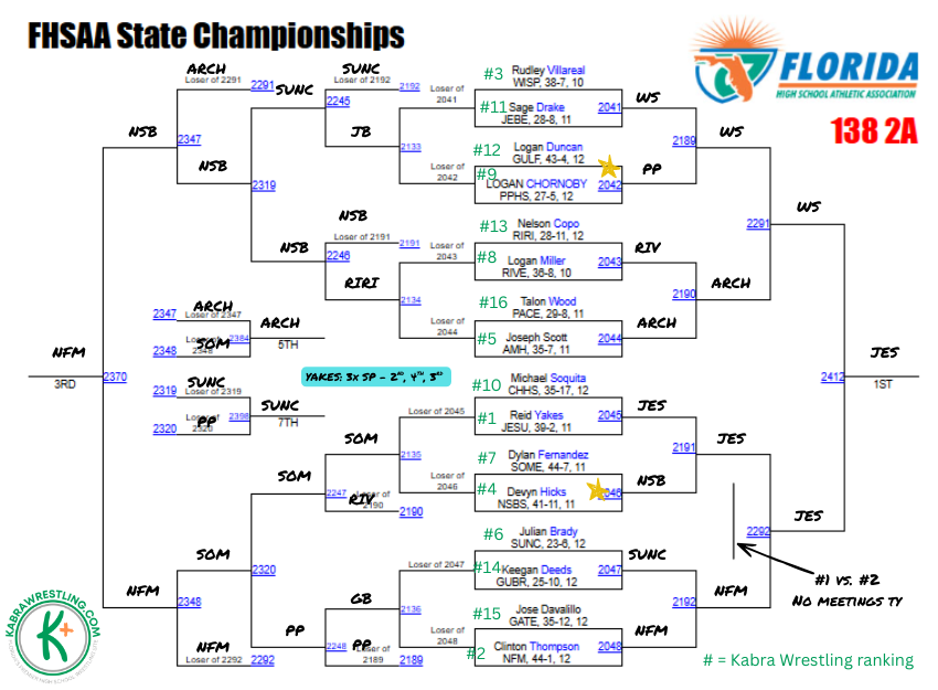 Kabra says: Chavis is the healthy favorite in this weight, he’s beaten Johns, Loveland, Mendez, and Suarez this season. With four of the top six in the top half of the bracket, who the Lake Gibson sophomore faces in the final should be a dogfight. We’re willing to admit when we may have gotten a ranking wrong and in researching this weight class, we remembered that Loveland edged Johns 2-1 in last year’s third place match. Either way, expect massive fireworks in the top half starting in the quarterfinal round.