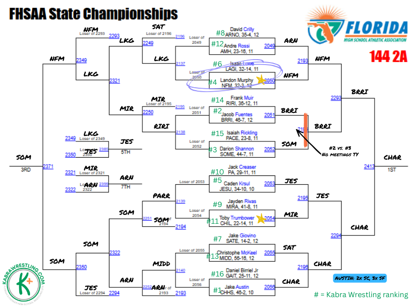 Kabra says: Two-time defending state champion Austin is the favorite here. The Charlotte sophomore has reached the finals three times so far in his career. The bracket gives up a coin toss quarterfinal between #2 Fuentes and #3 Shannon. They have not met. Austin is 4-0 this season against Fuentes should the Braden River senior reach the final.